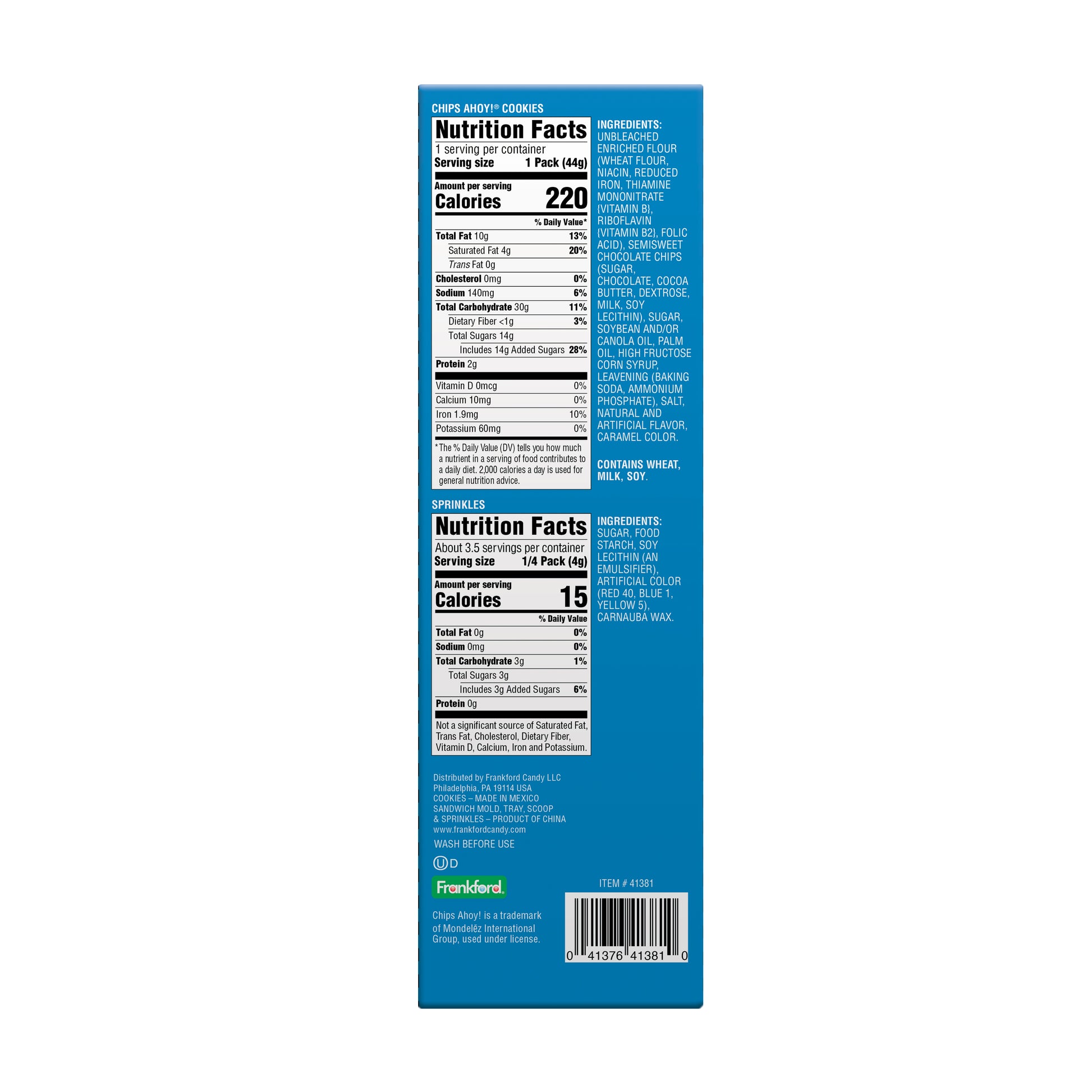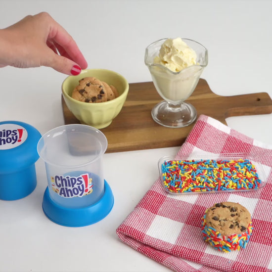 Create your own delicious treats at home with the Chips Ahoy! Ice Cream Sandwich Maker. This fun set includes Chips Ahoy! cookies, a sandwich mold, scoop, tray, and colorful sprinkles so you can build the ultimate ice cream sandwich. Perfect for kids, families, and cookie lovers, it’s a playful and tasty way to enjoy a classic dessert anytime. Net Weight 2.05 oz.