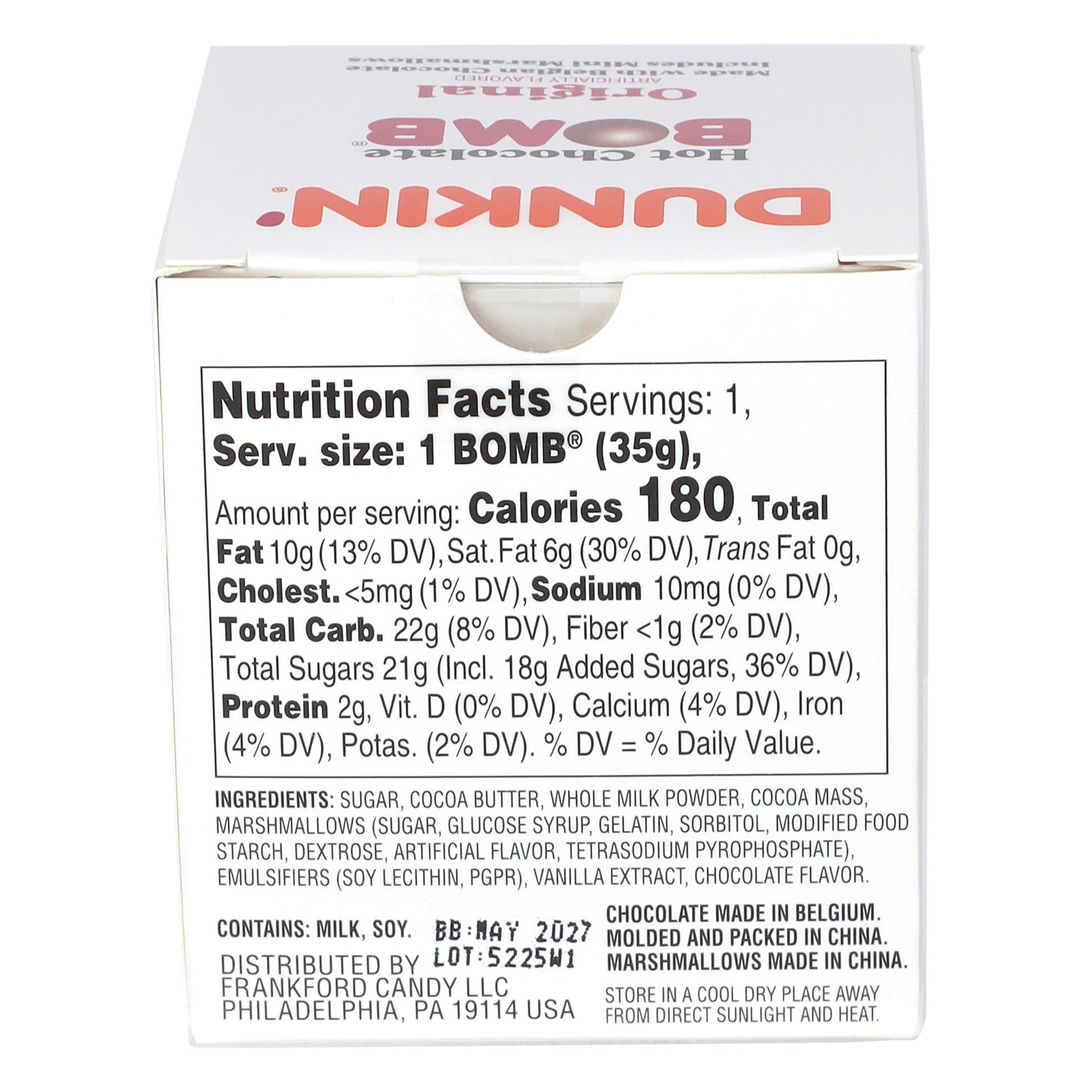 Dunkin' Original Hot Chocolate Bomb® features a rich Belgian milk chocolate exterior filled with mini-marshmallows inside. Simply place the Bomb® in a mug, pour 6 ounces of hot milk over it and watch the hollow ball transform into a rich, creamy, decadent hot cocoa treat.