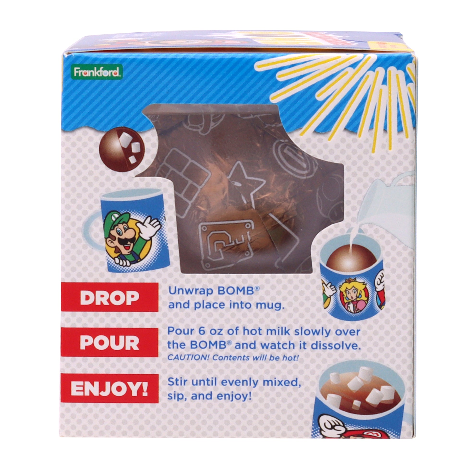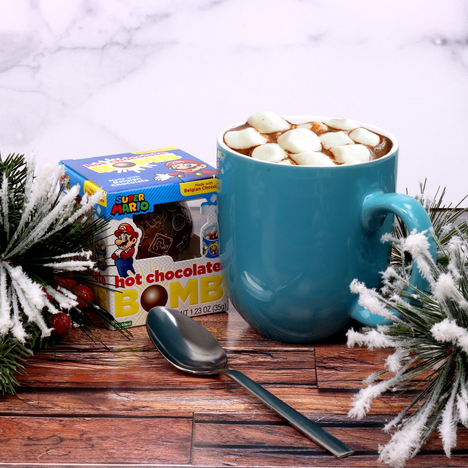 Level up your hot cocoa game with our deliciously fun Super Mario Hot Chocolate BOMB®. Crafted with real Belgian milk chocolate, each melting ball includes tiny marshmallows inside for the ultimate hot chocolate experience. Simply place the BOMB® into your mug, pour warm milk on top, stir, and watch it melt into a silky hot chocolate drink. Makes the perfect gift or stocking stuffer for Super Mario fans and video game lovers of all ages. Each pack combs with 12 Hot Chocolate BOMBS®. Net Weight: 1.23 oz each.